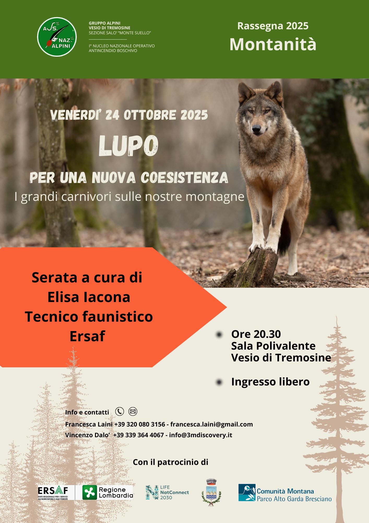 Si segnala la serata divulgativa promossa e supportata dal Gruppo Alpini di Vesio, "Lupo: per una nuova coesistenza. I grandi carnivori sulle nostre montagne", che si terrà venerdì 24 ottobre, Sala Polivalente ore 20.30.